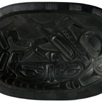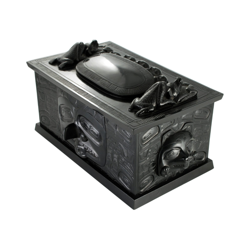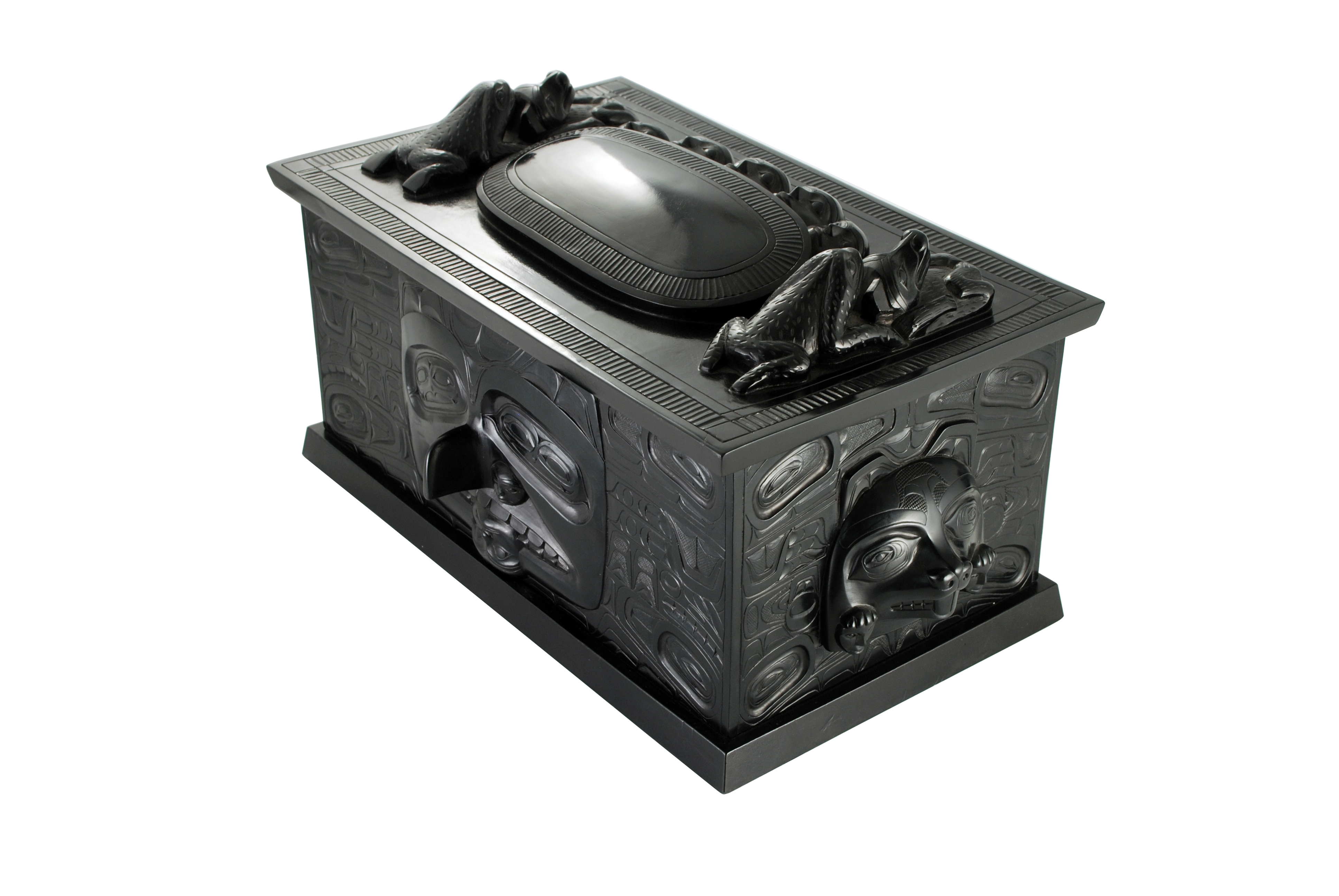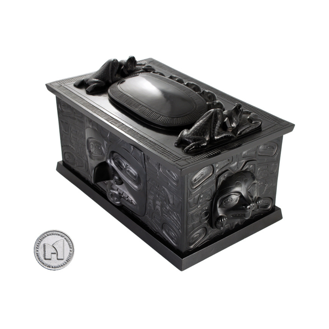 | Le couvercle de ce coffre richement sculpté représente l’histoire des premiers humains, qui émergent d’une coquille de palourde. Ces reproductions en résine de haute densité sont réalisées à partir de moulage de sculptures haïdas originales en argilite des collections du Musée canadien de l’histoire. L’argilite est une ardoise tendre que l’on ne trouve que sur Haida Gwaii. Les artistes haïdas sculptent dans ce matériau prisé par les commerçants depuis au moins le début du XIXe siècle. 33 x 20,25 x 16,25 cm. |
