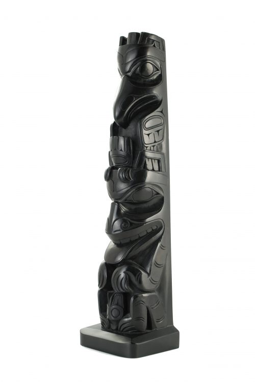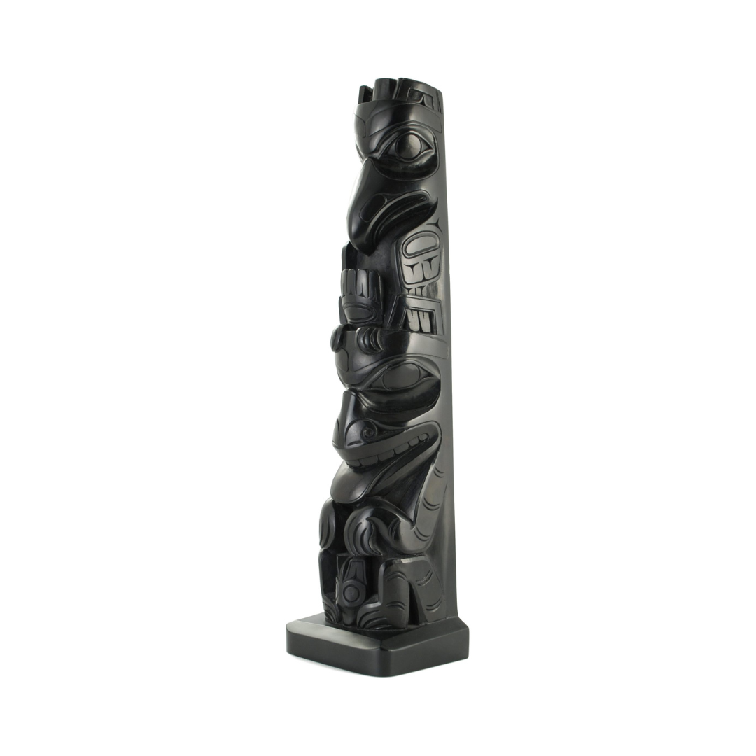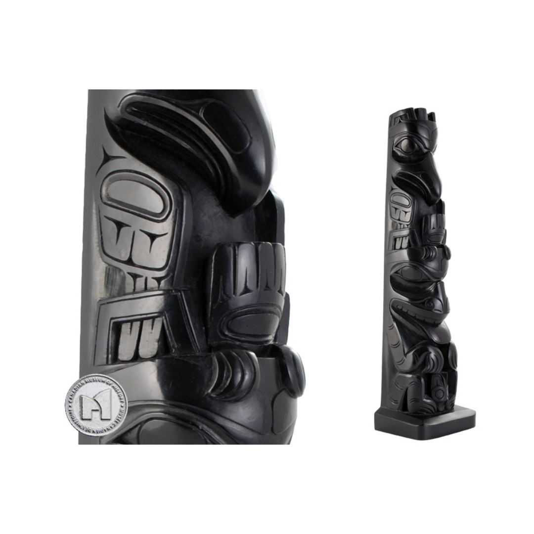 | Ce mât totémique représente Aigle et Ours. Ces reproductions en résine de haute densité sont réalisées à partir de moulage de sculptures haïdas originales en argilite des collections du Musée canadien de l’histoire. L’argilite est une ardoise tendre que l’on ne trouve que sur Haida Gwaii. Les artistes haïdas sculptent dans ce matériau prisé par les commerçants depuis au moins le début du XIXe siècle. 38 cm. |