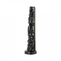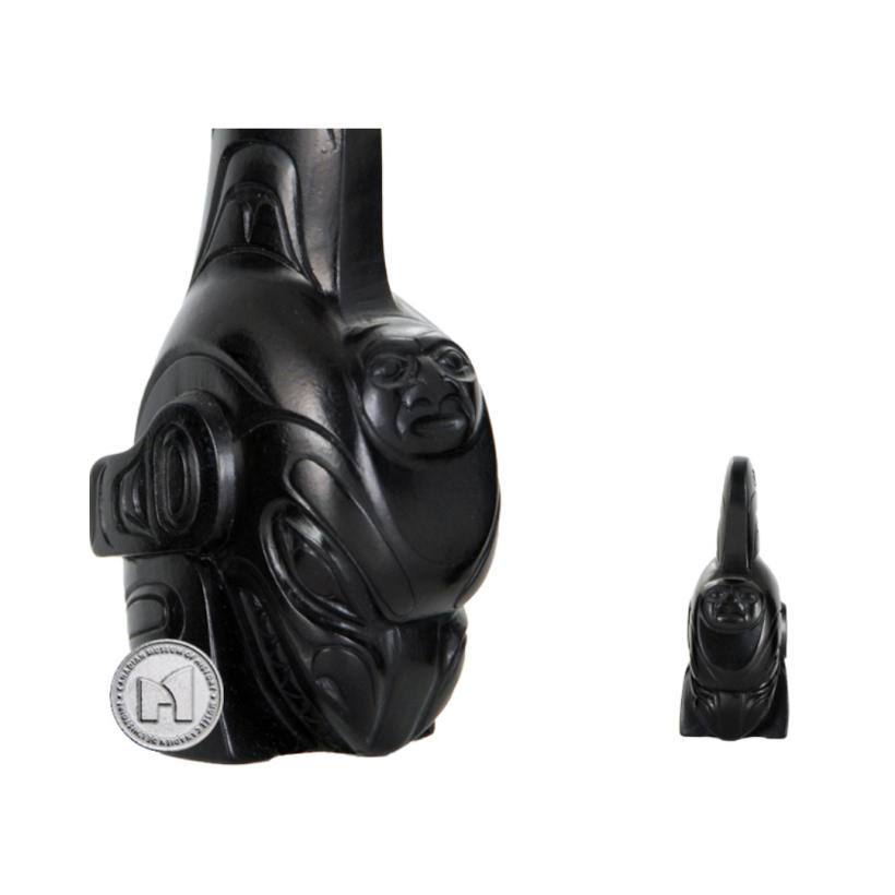 | Cet Épaulard, œuvre de l’artiste haïda contemporain Christian White (né en 1962), représente un chevalier dans un jeu d’échecs. Ces reproductions en résine de haute densité sont réalisées à partir de moulage de sculptures haïdas originales en argilite des collections du Musée canadien de l’histoire. L’argilite est une ardoise tendre que l’on ne trouve que sur Haida Gwaii. Les artistes haïdas sculptent dans ce matériau prisé par les commerçants depuis au moins le début du XIXe siècle. 6.5 cm. |