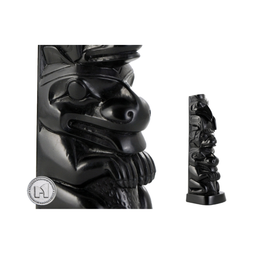 | Ce mât totémique représente Corbeau et Ours avec d’autres personnages. Ces reproductions en résine de haute densité sont réalisées à partir de moulage de sculptures haïdas originales en argilite des collections du Musée canadien de l’histoire. L’argilite est une ardoise tendre que l’on ne trouve que sur Haida Gwaii. Les artistes haïdas sculptent dans ce matériau prisé par les commerçants depuis au moins le début du XIXe siècle. 19 cm. |