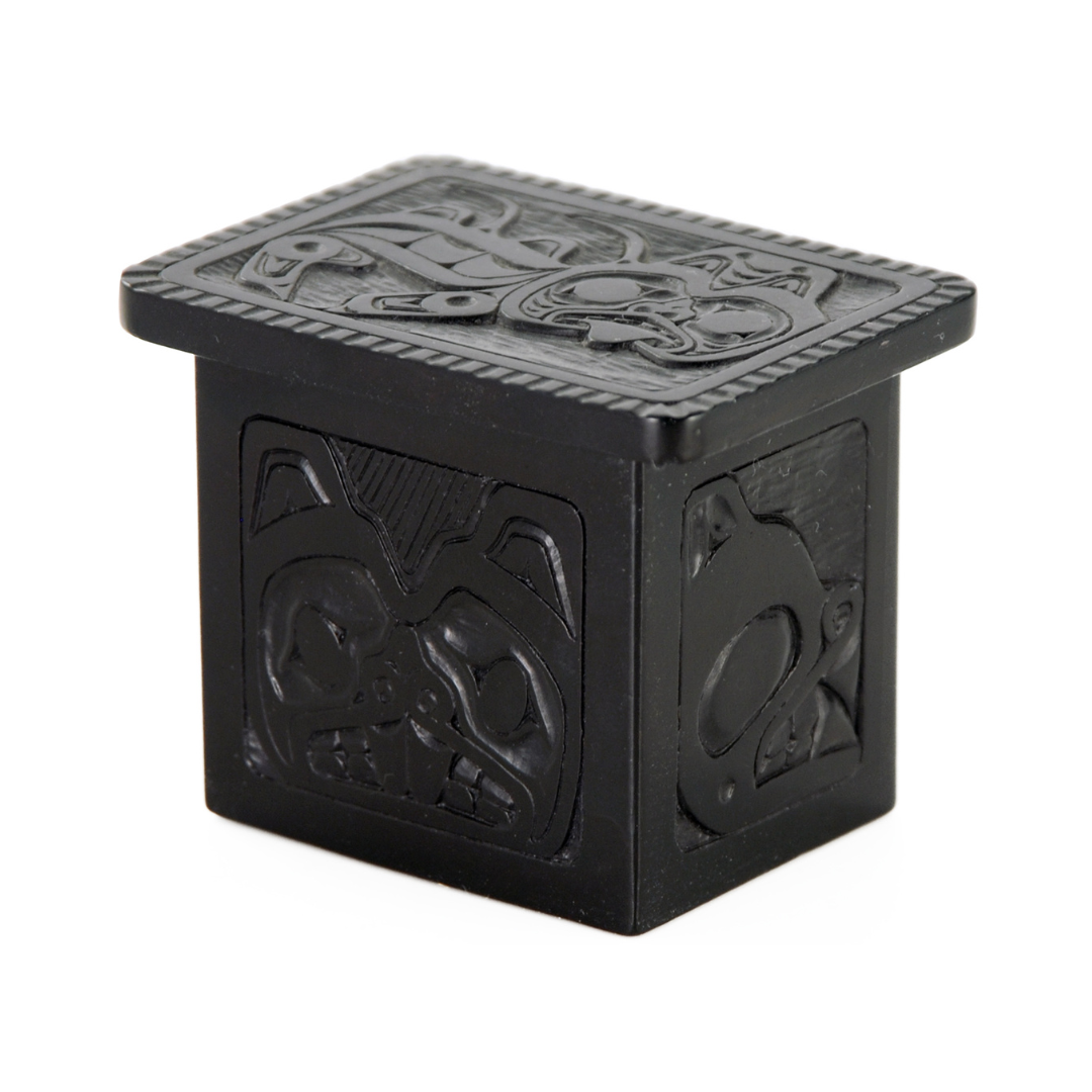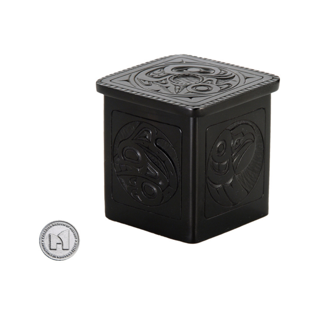 Cette boîte carrée, œuvre d’un artiste haïda, représente le Monstre de la mer et fait 6,25 cm de hauteur. Les reproductions d’argilite en résine de haute densité sont réalisées à partir de moulages de sculptures haïdas en argilite originales des collections du Musée canadien de l’histoire. L’argilite est une ardoise tendre que l’on ne trouve que dans Haida Gwaii (les îles de la Reine-Charlotte); elle fut extraite pour la première fois dans les années 1820 sur le Mont Slatechuck.