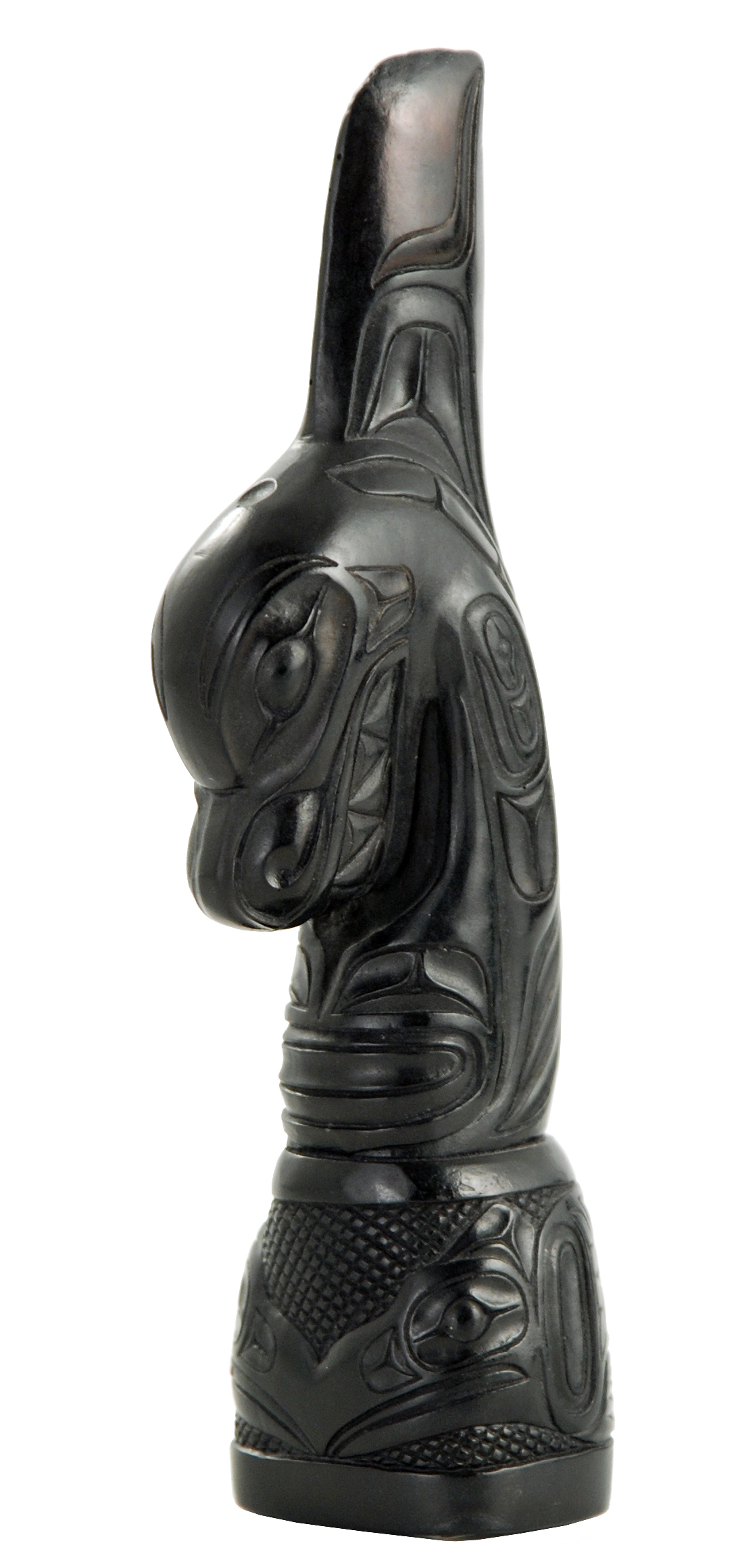 | Cette sculpture représente Épaulard au-dessus de Corbeau, œuvre de l’artiste haïda contemporain Ed Russ (1953-2006). Ces reproductions en résine de haute densité sont réalisées à partir de moulage de sculptures haïdas originales en argilite des collections du Musée canadien de l’histoire. L’argilite est une ardoise tendre que l’on ne trouve que sur Haida Gwaii. Les artistes haïdas sculptent dans ce matériau prisé par les commerçants depuis au moins le début du XIXe siècle. 12 cm. |