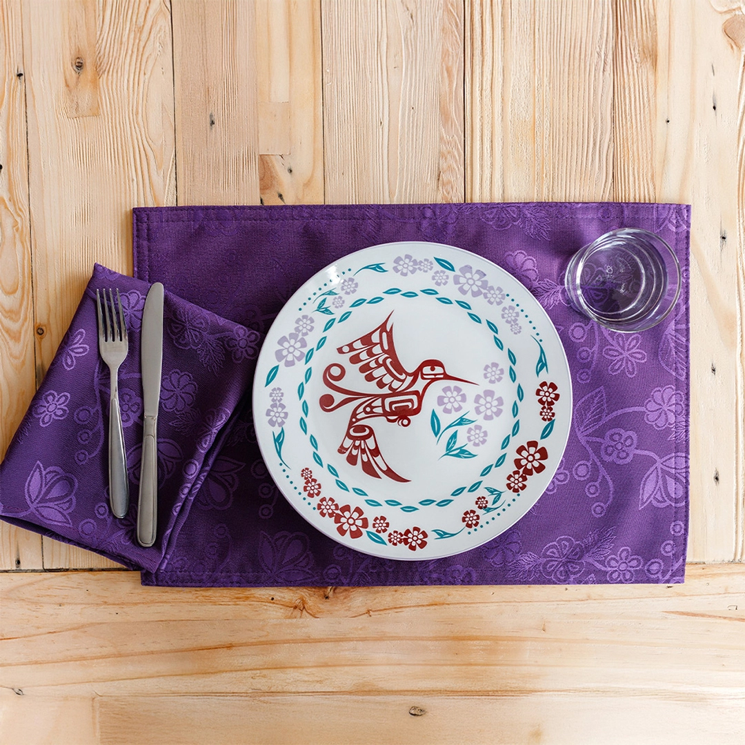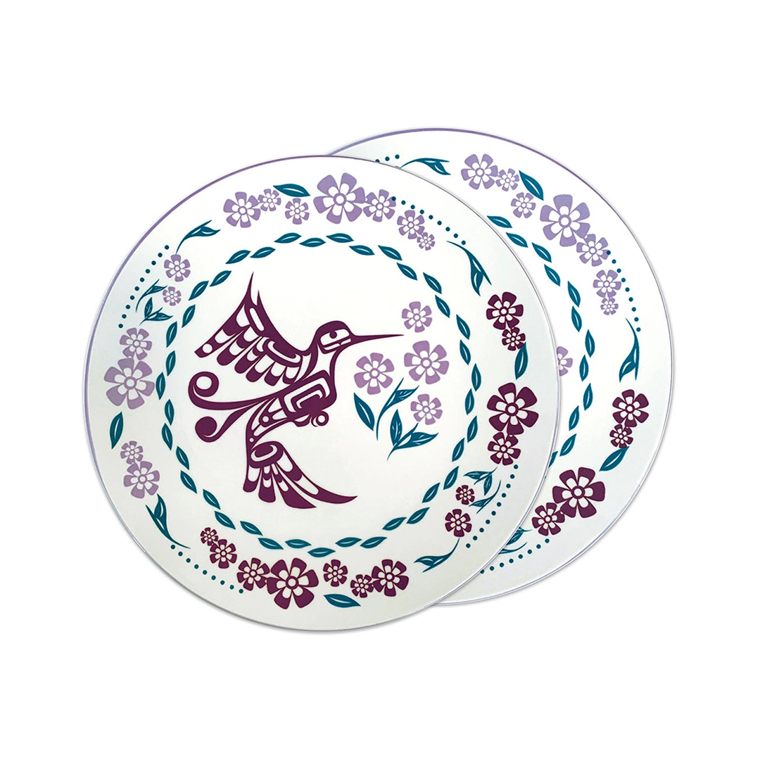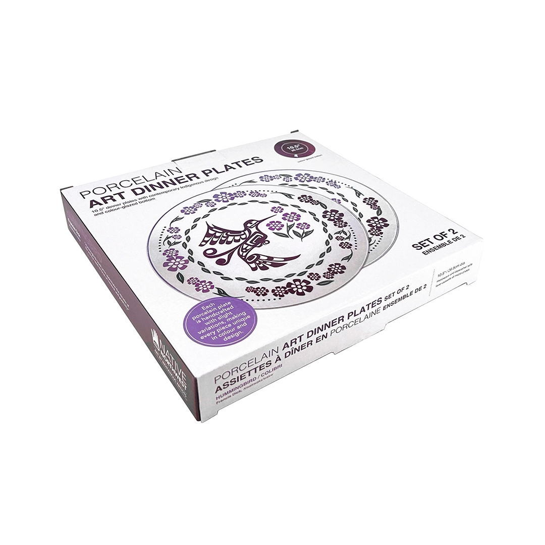 Cet ensemble de 2 assiettes en porcelaine est orné de l’œuvre Colibri, conçue par l’artiste Kwakwaka’wakw Francis Dick. Ces assiettes rondes de 10,5 pouces ajoutent une touche culturelle unique à votre table à manger et constituent d’élégantes pièces décoratives. Chaque ensemble est emballé individuellement, ce qui les rend parfaits pour offrir en cadeau ou pour sublimer votre expérience culinaire.