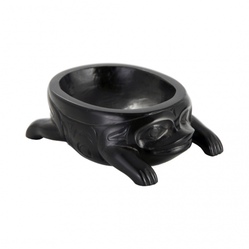 | Ce bol représente Grenouille. Ces reproductions en résine de haute densité sont réalisées à partir de moulage de sculptures haïdas originales en argilite des collections du Musée canadien de l’histoire. L’argilite est une ardoise tendre que l’on ne trouve que sur Haida Gwaii. Les artistes haïdas sculptent dans ce matériau prisé par les commerçants depuis au moins le début du XIXe siècle. 10 x 7 cm. |