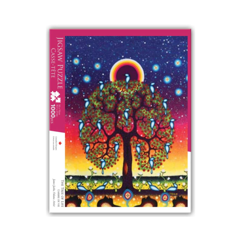 Conçu par l’artiste Odawa / Potawatomis James Jacko, ce casse-tête de 1000 pièces est imprimé sur un carton de haute qualité et laminé avec une finition mate. L’arbre symbolise toute la connaissance qui nous a été donnée par le Créateur et il est la force et le fondement de tout ce qui est dans la vie.