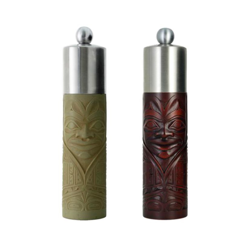 Ces moulins à sel et à poivre uniques ont été sculptés par l’artiste de la côte ouest Mark Garfield. Les manches en verre recyclé représentent un chef haïda magnifiquement sculpté, en habit cérémonial avec couvertures Chilkat.