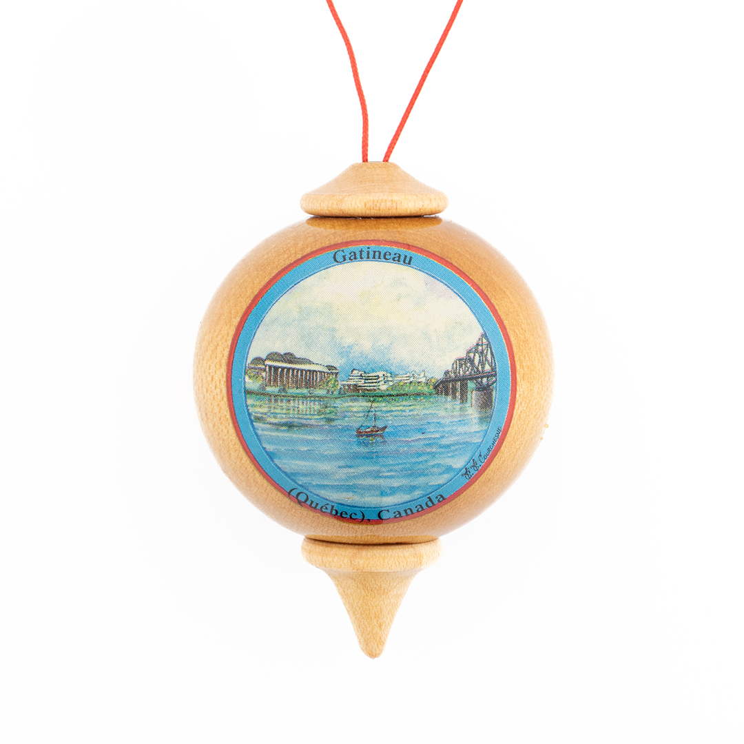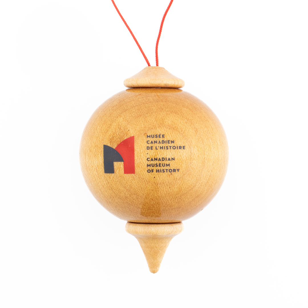Fabriqué à la main au Canada, cet ornement en bois fait un souvenir ou un cadeau idéal du Musée canadien de l’histoire. On y voit à l’avant une superbe vue du musée depuis la rivière des Outaouais, et à l’arrière, le logo du musée.