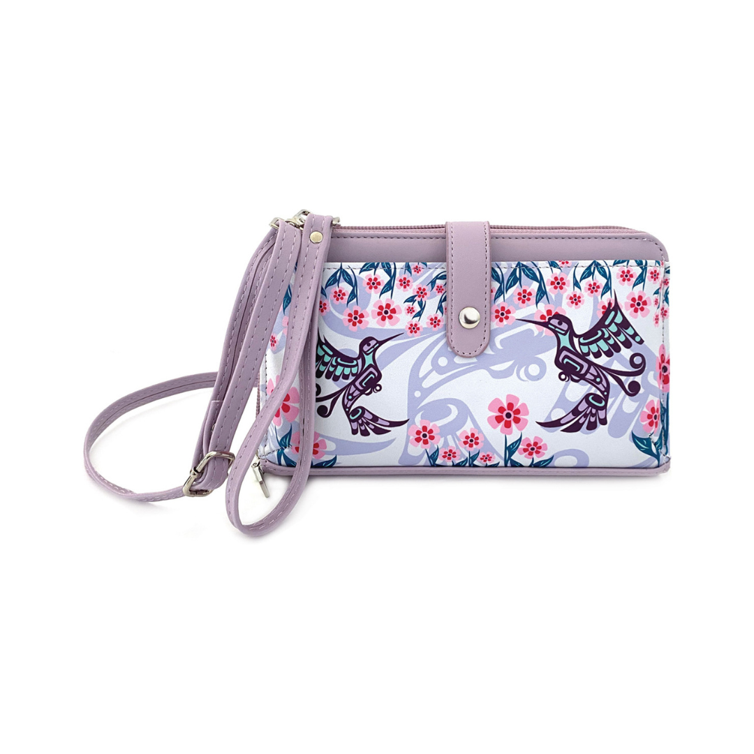 Ce sac à bandoulière est un accessoire élégant et polyvalent pour la vie moderne. Fabriqué en cuir végétalien, il peut contenir votre téléphone intelligent, vos cartes, de l’argent et vos clés. Avec sa fermeture éclair principale, sa pochette avant et son intérieur doté de 8 fentes pour cartes, de deux poches et d’une pochette à glissière, il vous permet de rester organisé lors de vos déplacements. Portez-le comme un sac à bandoulière, avec un bracelet, en portefeuille ou en pochette – c’est vous qui choisissez. Colibris a été conçu par l’artiste Kwakwaka’wakw Francis Dick.
