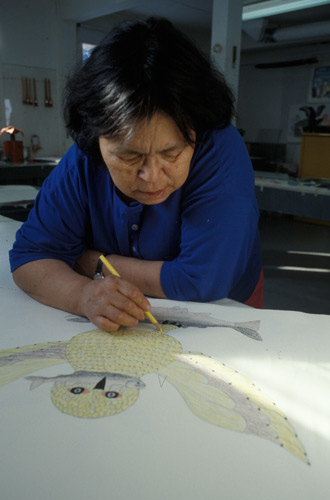 - L’artiste, ou dessinateur, crée un dessin original sur papier et le soumet à l’atelier. L’atelier de gravure achète pratiquement tous les dessins réalisés par les artistes inuits de Cape Dorset. À partir de cette banque de dessins, les graveurs et l’administrateur de l’atelier choisissent chaque année en collaboration un petit ensemble d’images à partir desquelles réaliser des gravures.