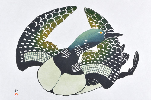 Pendant plus de mille ans, les Inuits ont vécu des richesses naturelles de l’Arctique, mammifères marins, poissons et divers oiseaux et animaux terrestres. Dans des temps reculés, les familles habitaient en pleine nature dans des iglous en neige ou dans des tentes de peau, se déplaçant au rythme des saisons pour chasser le phoque, le morse, la baleine, le caribou, l’oie et le bœuf musqué. Ces animaux fournissaient des aliments nourrissants, des peaux pour les vêtements, de l’huile pour les lampes et la plupart des matières premières à partir desquelles on fabriquait des outils, des jeux et différents biens. D’autres animaux, tous remarquablement adaptés à la vie au-delà de la limite des arbres, revêtaient également une importance cruciale pour les Inuits : les ours polaires, les renards, les loups, les lièvres, les carcajous, les spermophiles, les belettes, les lemmings, les poissons et les palourdes. Bien entendu, les animaux sont fréquemment représentés sur les estampes de Cape Dorset, évoquant le lien immémorial qui unit les Inuits et leur milieu naturel.