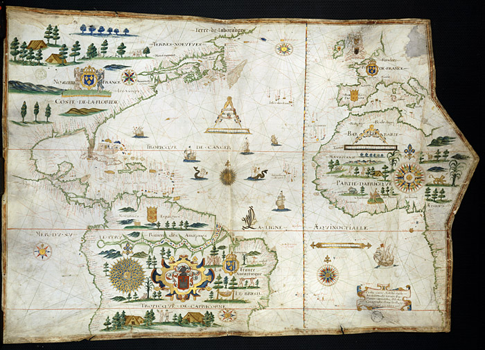 À la recherche d’une route occidentale vers l’Asie, les navigateurs européens, au XVIe siècle, découvrent des territoires dont les dimensions, les ressources et les populations leur étaient encore inconnues. En fait, les marins se heurtent à un double continent, l’Amérique. Avec constance et détermination, les souverains envoient alors des explorateurs reconnaître ces « terres neufves » et les cartographier en vue d’y fonder des établissements. Le secret des rivages aperçus et des terres convoitées est toutefois bien gardé. Tous ces voyageurs conservent jalousement les observations qu’ils ont pu faire durant leurs périples. Ainsi, les lieux seront longtemps présentés comme un monde imaginaire, soit par ignorance du réel, soit pour conserver secrètes les découvertes et pour maintenir l’espoir de trouver des richesses encore plus grandes.