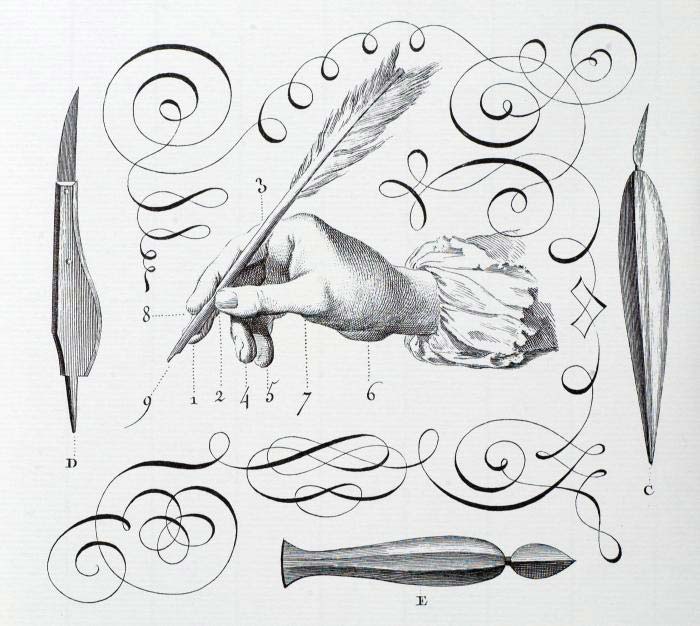 L’art d’écrire, planche II de l’Encyclopédie, ou dictionnaire raisonné des sciences, des arts et des métiers, 1762-1772, par Diderot et d’Alembert