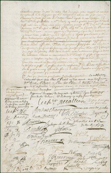 La communication fut essentielle à la formation de la Nouvelle-France. À l’instar d’autres sociétés de l’Ancien Régime, la Nouvelle-France se caractérisait par une culture ayant de solides éléments écrits et oraux – une « culture textuelle coloniale », pour reprendre la terminologie de l’historien Gerry Friesen. Le peuple baignait au quotidien dans une culture en apparence dominée par l’oral alors que, en réalité, sa vie était structurée par d’importants documents écrits. Les textes sacrés et les catéchismes, les contrats de mariage, les paiements de rentes seigneuriales, les registres de marchands, les ordonnances émanant d’autorités coloniales et les documents écrits précieusement conservés dans un coffre avec d’autres objets de valeur étaient tous directement liés à la vie et aux moyens de subsistance de la population. L’oral et l’écrit allaient donc de pair en Nouvelle-France. Pour interpréter l’interaction de ces deux éléments, nous examinerons la communication à diverses échelles de la vie sociale.